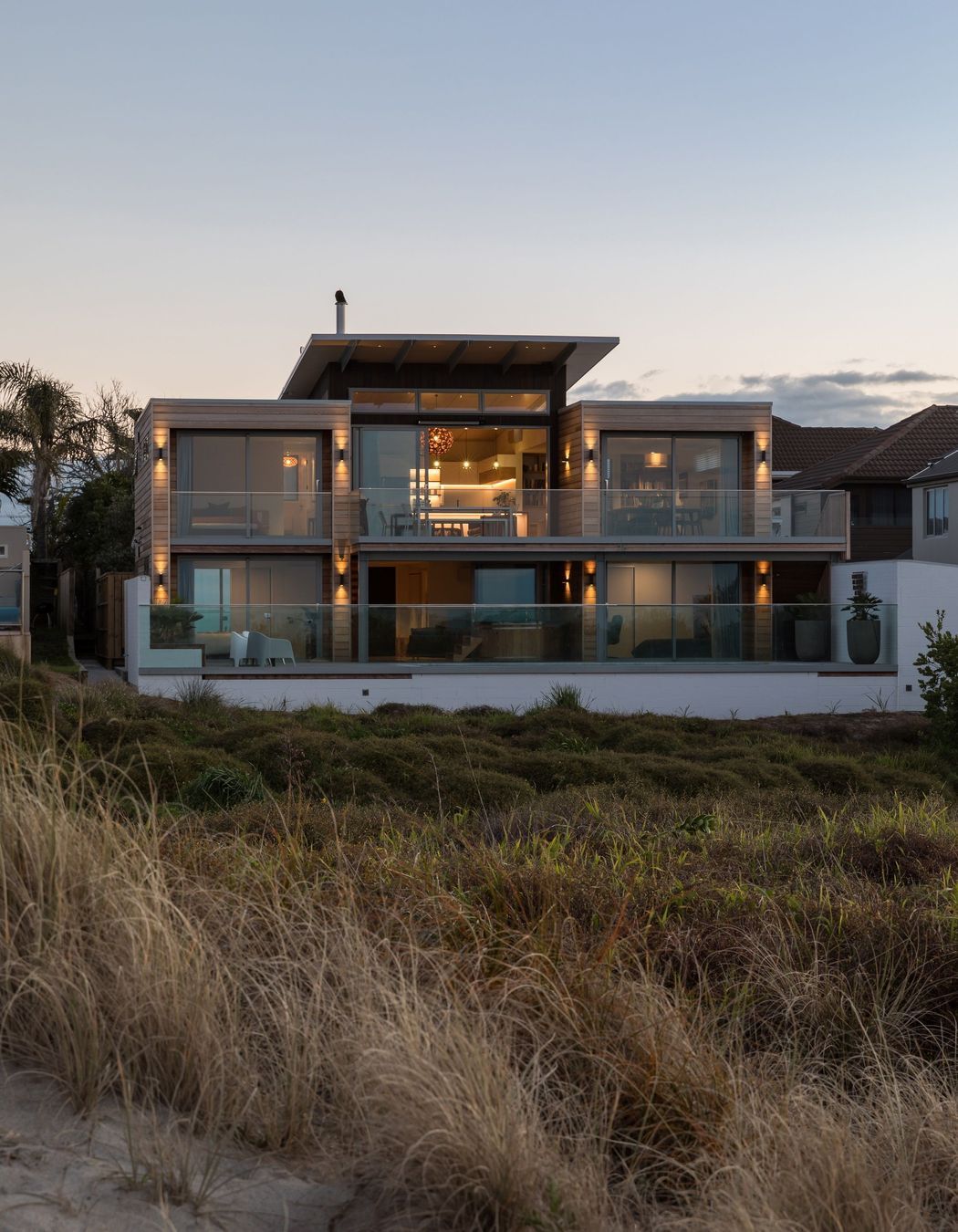 ArchiPro Project Summary - A harmonious beachfront residence that blends natural aesthetics with functional design, featuring elevated living spaces, expansive ocean views, and a unique combination of cedar weatherboard cladding and diverse wood elements.